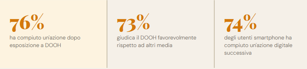 Questi tre dati, letti insieme, restituiscono un profiloin atteso: il DOOH non è soltanto il medium più apprezzato tra quelli analizzati, ma è anche quello che produce il tasso più alto di risposta comportamentale dichiarata, e lo fa tanto nel mondo fisico quanto in quello digitale.