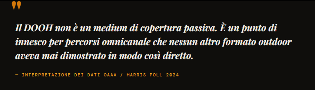I dati dello studio OAAA/Harris Poll 2024 suggeriscono che questa penalizzazione potrebbe essere fondata su premesse errate, o almeno incomplete. Il DOOH non è solo un medium di copertura: produce comportament imisurabili, innesca percorsi digitali tracciabili e, in presenza di creatività rilevante e contestualizzazione geografica, genera tassi di conversione che sfidano il confronto con canali considerati più "performativi".