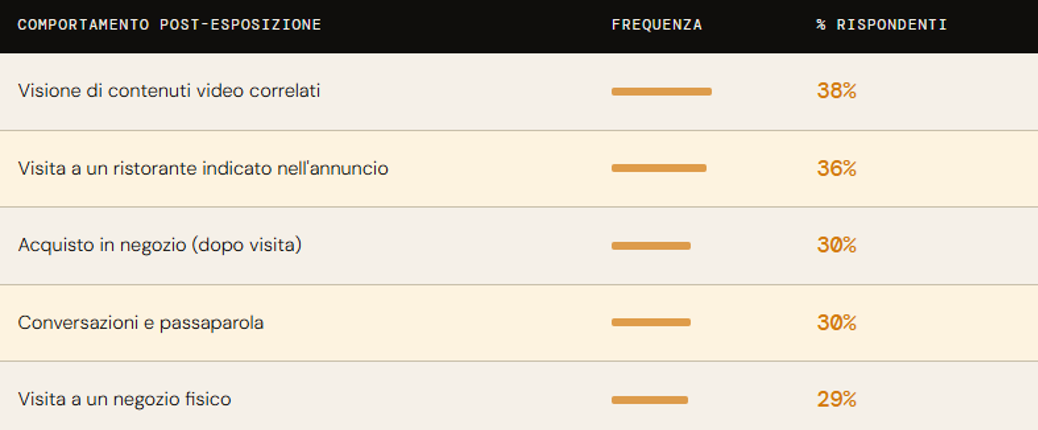 La ricerca non si ferma alla percezione, ma classifica le azioni effettivamente compiute dopo l'esposizione a un annuncio DOOH. È questa la parte metodologicamente più rilevante: misura comportamento dichiarato, non intenzione.