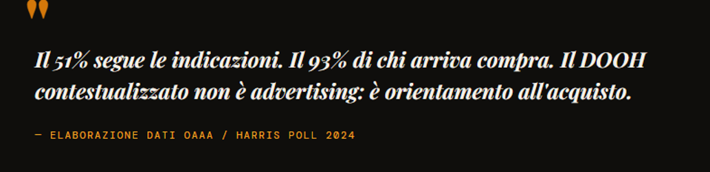 Quest'ultimo punto merita una riflessione a parte. Un annuncio DOOH che fornisce indicazioni stradali verso un punto vendita converte quasi l'intero segmento di utenti che decide di seguirle. Il 93% di conversion rate su chi raggiunge il negozio è un numero che la maggior parte dei canali digitali, con tutto il loro vantaggio in termini di targetizzazione, non riesce a eguagliare.