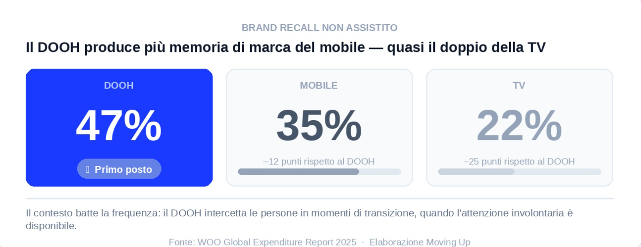 Se c'è un numero in questo scenario che ancora fatica a fare breccia nella conversazione quotidiana di agenzie e clienti, è questo: il tasso di brand recall non assistito del DOOH è del 47%.